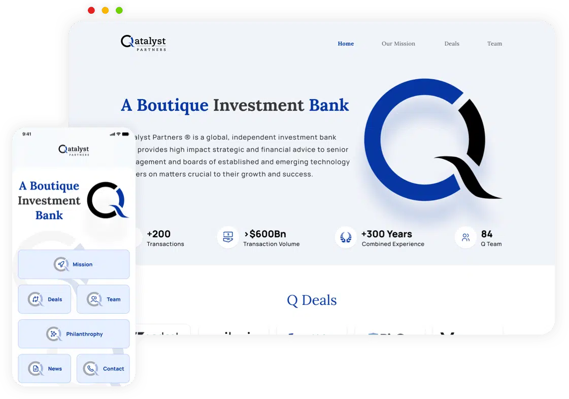 A website and mobile app reflect the corporate identity and a rich portfolio of deals by Qatalyst Partners.